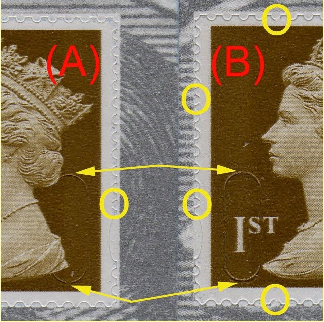 So - a deliberate change because either the printer had problems preparing the books or Royal Mail had problems with the handling & FDCs for this pane, or just a minor variation. Or is it, perhaps, something that Royal Mail's production department have introduced to make Machin collectors even more interested, something to get you keenly examining every copy of every new stamp to find out whether there are unannounced differences ?
